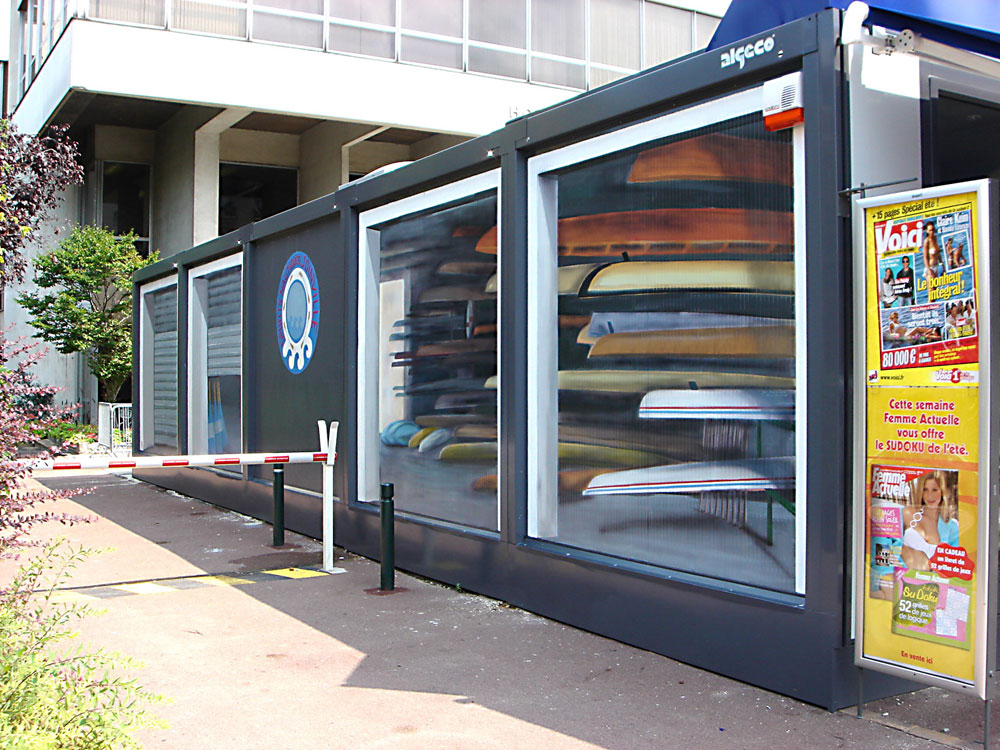 Réalisation d'une anamorphose pour arriver à obtenir du point de vue de l'entrée du parking, cette impression de hangar à avirons.